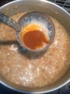 Masak nasi mcam nak mkan nasi air. Lpas tu masukkan ubi kledek, sotong yg dpotong kecik2, (lada hitam,bawang merah & halia d hiris nipis2 @ blender je senang), sedikit halba, serai, santan,paku pakis warna coklat, sdikit daun kesum, sdikit budu, garam,gula & ajino.